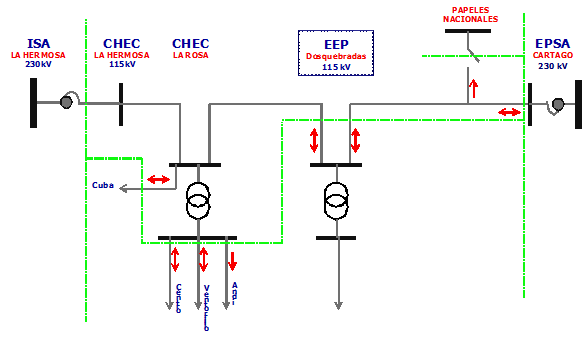 En la línea La Rosa – Dosquebradas existen físicamente dos medidores (uno de energía activa y el otro de energía reactiva) que cuando se registra el flujo de energía en un sentido, ésta se contabiliza bajo el código de una frontera comercial y cuando la energía fluye en sentido contrario, la energía es contabilizada bajo otro código de frontera comercial. De esta manera, existen dos fronteras comerciales registradas en una misma línea, que corresponden a un juego de medidores bidireccionales. Igual situación se presenta en la línea Dosquebradas-Cartago.