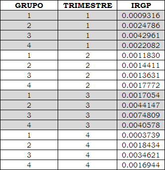 Se utilizó un valor de cero para el IRGn,q,p,k del Grupo de Calidad 4 en la determinación del IRADKn,p,k, cuando en un trimestre no existía información para dicho grupo, por tanto al no existir este dato se debió aplicar el promedio de las variables IRGn,q,p,k de los Grupos de Calidad respecto de los cuales se tenía información en cada trimestre, atendiendo lo ordenado en la Resolución.