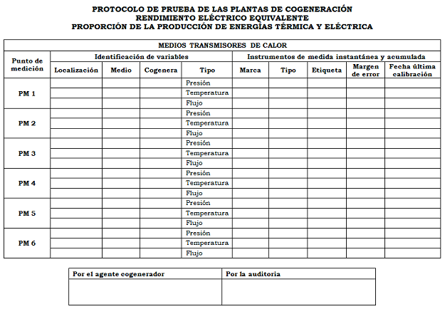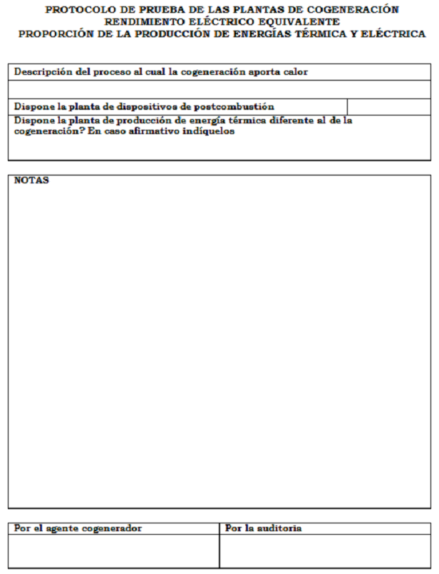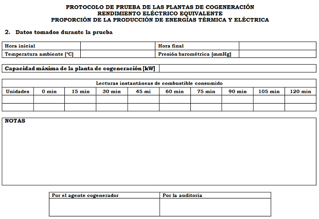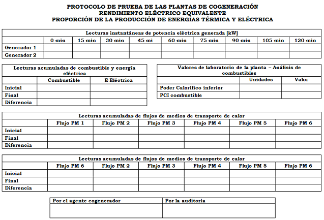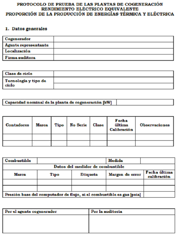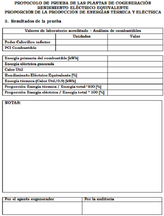 Como resultado de esta prueba se deberán obtener los valores del Rendimiento Eléctrico Equivalente (REE) y la Producción mínima de energía eléctrica y térmica en el proceso.