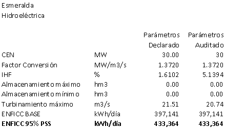 Los siguientes son los resultados del informe de verificación de parámetros de PwC AG sobre la planta y/o Unidad de Generación ESMERALDA, los cuales le permiten expresar que el valor reportado para el parámetro de Indisponibilidad Histórica Forzada Planta Hidraúlica - IHF, presenta una discrepancia: