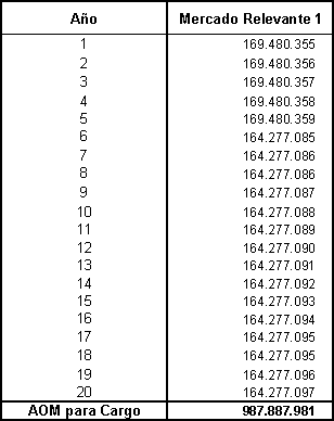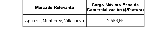 ARTÍCULO 6°. Cargo Máximo Base de Comercialización. A partir de la vigencia de la presente Resolución, el cargo máximo base de comercialización aplicable en el Mercado Relevante del Artículo 1, es el siguiente.