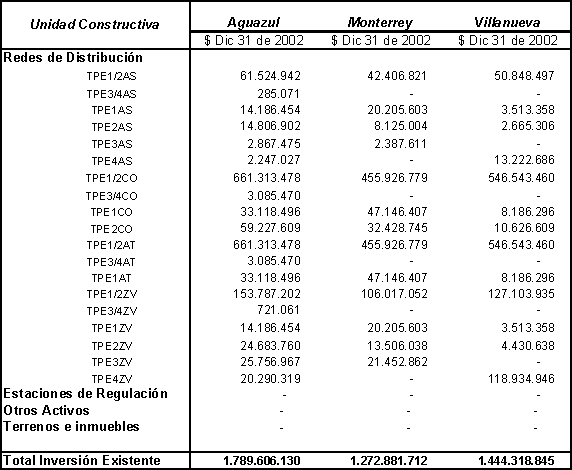 2.1. Inversión Existente. Como inversión existente se reconoce un monto de $4.506.806.687 ($ del 31 de Diciembre de 2002), de conformidad con la desagregación de activos presentada en el Anexo 1A de la presente Resolución.