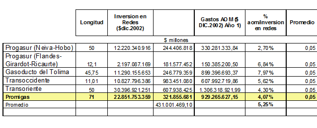 De acuerdo con los estados financieros los gastos AOM de PROMIGAS para el año 2002 fueron de 903 millones, comparado con lo solicitado por PROMIGAS en el año 1 (2.044 millones), por lo que la CREG solicitó en su momento la justificación para un incremento tan considerable en los gastos.