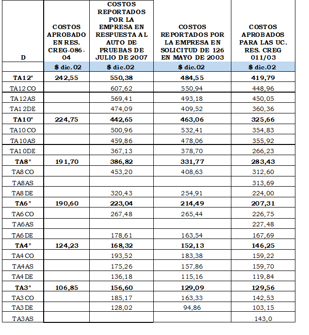 Comparando la información reportada en la respuesta al Auto de Pruebas de julio de 2007, contra la información reportada en la solicitud tarifaria, comunicación CREG 2003-5540, tenemos lo siguiente: