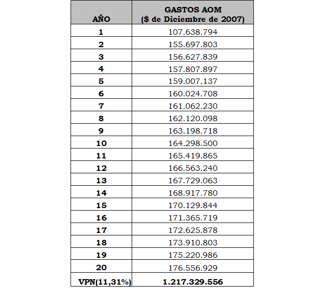 | Valor Presente de los gastos de AOM, con nivel de eficiencia. | $1.217.329.556