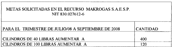 “Por lo anterior, se solicita sea revisado, analizado y evaluada la información reportada al SUI de la SSPD respecto a las compras y ventas de GLP por parte de MAKROGAS S.A. E.S.P. en el último año de operación, teniendo en cuenta además nuestra participación en el mercado colombiano y regional y por ende lo que le correspondería en el actual parque universal de cilindros y se solicita respetuosamente la aceptación al Recurso y las asignaciones de metas para el período del 1 de Julio de 2008 a 30 de Septiembre 2008 y del 1 de Octubre/08 a 31 de Diciembre/08 así: