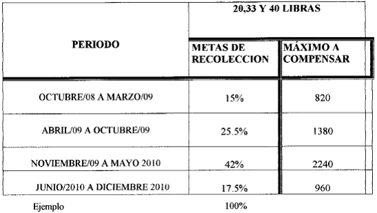 La distribución de estas metas en el tiempo se hizo de tal forma que al inicio del período de transición fueran más flexibles y se fueran concentrando hacia el intermedio del período. Así las metas se distribuyeron para ser ejecutadas en cuatro vigencias con la siguiente distribución del total estimado para recolectar en cada una de ellas, para la primera vigencia se tuvo en cuenta el 15% del parque total, para la segunda el 26%, para la tercera el 41% y para la cuarta el 18%.