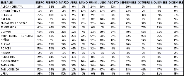 * EMBALSES BOGOTÁ se refiere al agregado de los siguientes embalses: SISGA, TOMINE, NEUSA, CHUZA, y MUÑA.