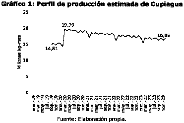 Teniendo en cuenta lo anterior, el Gráfico 1 muestra el perfil de producción de Cupiagua que se estima para el período 2019 - 2023. Entre septiembre de 2019 y febrero de 2020 se prevé una producción promedio de 15 millones de kilogramos-mes, la cual estará condicionada a las ventas de gas natural del campo.”