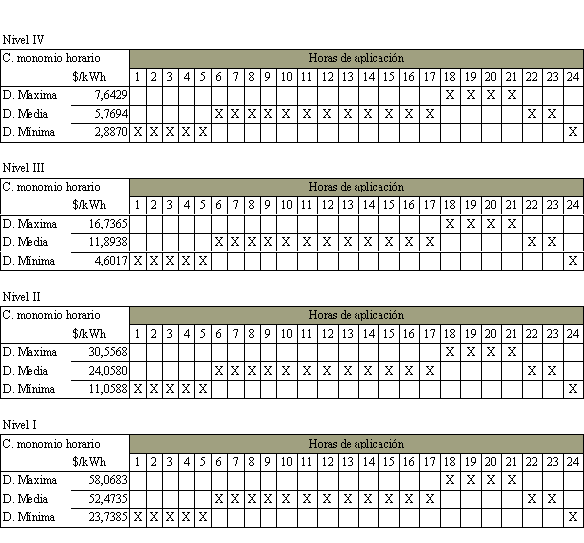 “Cargos monomios horarios. Los cargos monomios horarios por uso del Sistema de Transmisión Regional y/o Distribución Local operado por la Centrales Hidroeléctricas de Caldas S.A.-E.S.P., serán los siguientes, a pesos de diciembre de 1996: