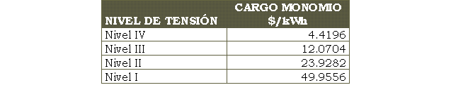 Artículo 1º. Cargos monomios. Los cargos monomios por uso del Sistema de Transmisión Regional y/o Distribución Local operado por la Empresa de Energía del Pacífico S.A., serán los siguientes, a pesos de diciembre de 1996: