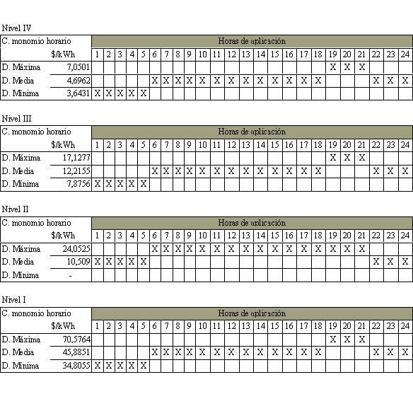 Artículo 2°. Cargos monomios horarios. Los cargos monomios horarios por uso del Sistema de Transmisión Regional y/o Distribución Local operado por la Electrificadora del Huila, serán los siguientes, a pesos de diciembre de 1996: