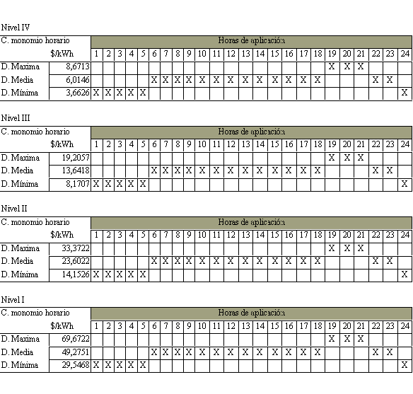 Artículo 2°. Cargos monomios horarios. Los cargos monomios horarios por uso del Sistema de Transmisión Regional y/o Distribución Local operado por la Empresa Municipal de Energía de Popayán, serán los siguientes, a pesos de diciembre de 1996: