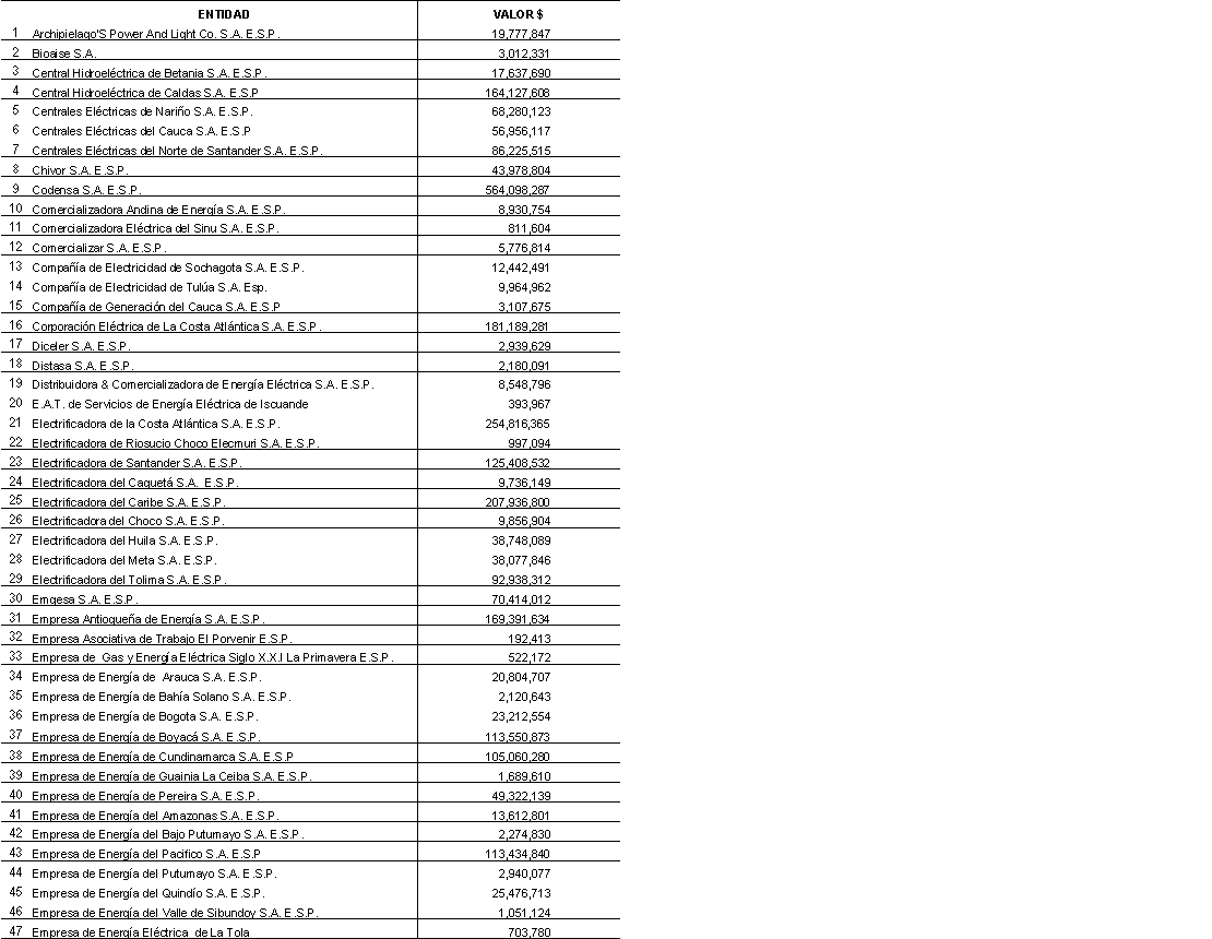 ARTÍCULO 1o. Las entidades del sector eléctrico sujetas a regulación, cancelarán el monto de la contribución especial, por el año 2001, así: