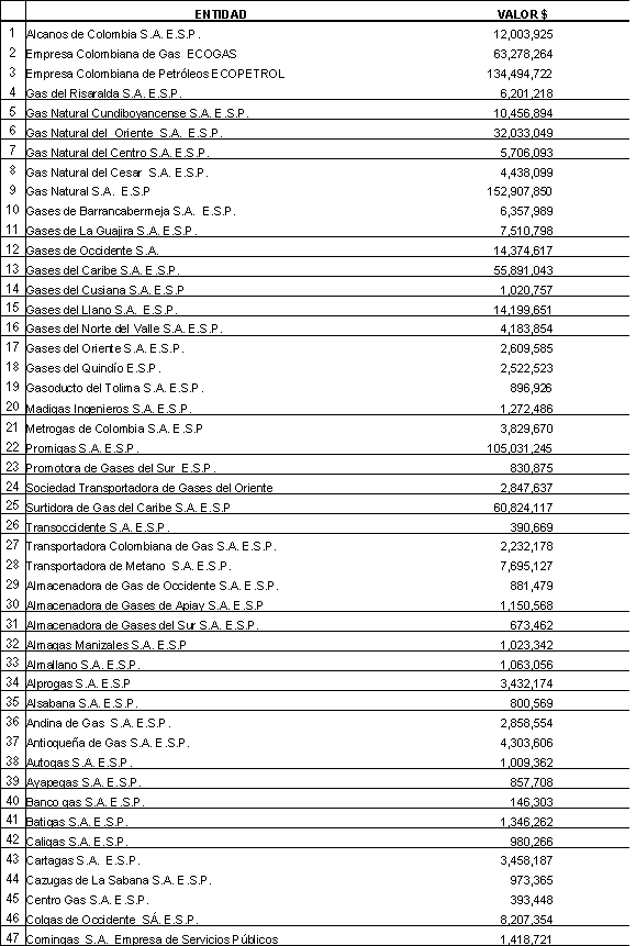 ARTÍCULO 2o. Las entidades del sector gas combustible sujetas a regulación, cancelarán el monto de la contribución especial por el año 2001, así: