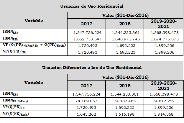 Aplicando la metodología contenida en la Resolución CREG 202 de 2013 y sus modificaciones y adiciones, se calcularon conforme a las formulas establecidas en los numerales 9.1.1.3. y 9.2.1.3. del artículo 9 para la componente que remunera la inversión base, aplicable a usuarios de uso residencial y a usuarios diferentes a los de uso residencial y se obtuvieron las siguientes variables principales: