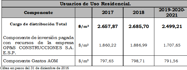 Dado que el sistema de distribución presentado por la empresa OP&S CONSTRUCCIONES S.A. E.S.P. para el mercado relevante conformado por los municipios de Argelia, El Águila y El Cairo en el departamento del Valle del Cauca, cuenta con red primaria y secundaria y todos sus usuarios están conectados a la red secundaria, se podrá determinar para este mercado relevante un solo cargo de distribución que será aplicable a los usuarios de uso residencial y usuarios diferentes al uso residencial.