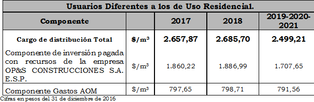 ARTÍCULO 6. Cargo de distribución aplicable a los usuarios diferentes a los de Uso Residencial. A partir de la vigencia de la presente Resolución, el cargo de distribución aplicable a los usuarios diferentes a los de uso residencial aplicable en el Mercado Relevante definido en el artículo 1°, para recuperar los costos de inversión y los gastos de AOM para la distribución domiciliaria de gas combustible por red se fija transitoriamente de la siguiente manera: