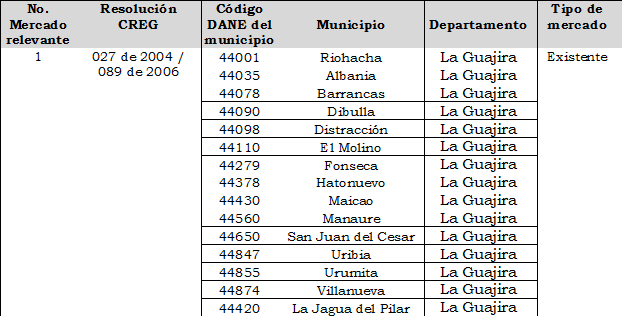 Mediante la Resolución CREG 027 de 2004 se aprobaron el Cargo Promedio de Distribución por uso del Sistema de Distribución de gas combustible por red y el Cargo Máximo Base de Comercialización de gas combustible por redes a usuarios regulados, para el mercado relevante conformado por los municipios de Albania, Barrancas, Dibulla, Distracción, El Molino, Fonseca, Hatonuevo, Maicao, Manaure, Riohacha, San Juan del Cesar, Uribia, Urumita y Villanueva en el departamento de Guajira, según solicitud tarifaria presentada por la empresa GASES DE LA GUAJIRA S.A. E.S.P.