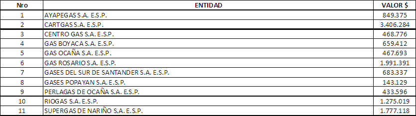 ARTÍCULO 2º.- Las siguientes entidades del sector de gas combustible sujetas a regulación, cancelarán el monto de la contribución especial, por el año de 2004, así: