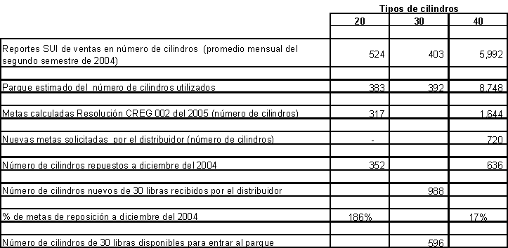 “Prueba de esto ha sido que la Sociedad GAS CORDILLERA S.A. E.S.P. no ha podido cumplir las metas de recambio impuestas en relación con los cilindros de 40 libras, tal y como consta en el informe de la firma "Diseños e Interventoria Ltda". Sobre seguimiento de cumplimiento de metas correspondientes los trimestres de Julio-Septiembre de 2003, Octubre- Diciembre de 2003 y Enero- marzo de 2004 e informe técnico sobre No. ITG 2004-006 sobre programa de mantenimiento y reposición de cilindros y tanques estacionarios, emitido por la Dirección Técnica de Gestión de Gas Combustible y sus anexos, por los factores anteriormente mencionados.