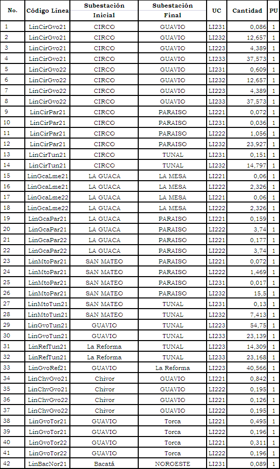 Empresa de Energía de Bogotá S.A. E.S.P. reportó a la CREG la base de activos eléctricos del STN que se encuentran en operación clasificados según el listado de unidades constructivas que aparece en el Capítulo 3 del Anexo General de la Resolución CREG 011 de 2009.