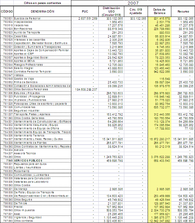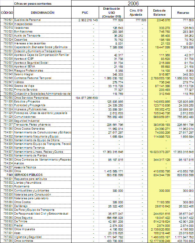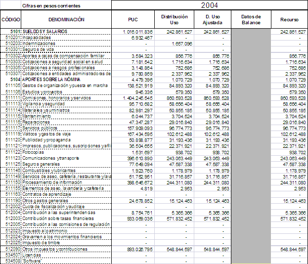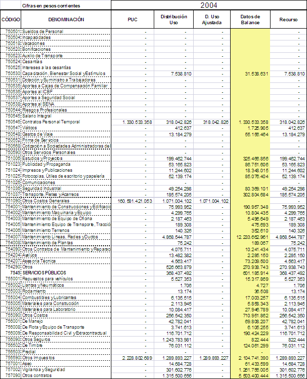 Esta situación se originó en el hecho de que en los reportes de costos y gastos realizados por ENERTOLIMA S.A ESP al Sistema Único de Información para el periodo 2004 al 2007, se agruparon las cuentas de la siguiente manera: