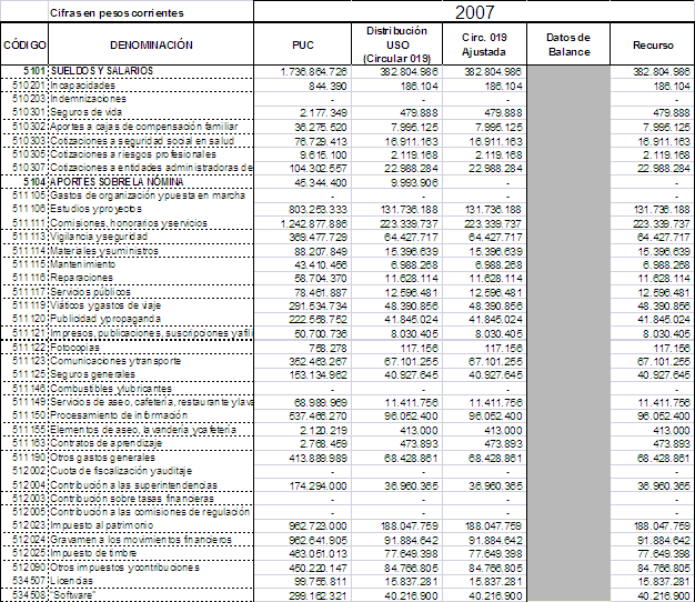Para el grupo de cuentas de la clase “5” se mantienen los mismos valores considerados en la aprobación de la resolución CREG 112 de 2009, ya que no fueron objeto del recurso. Para las cuentas de la clase “7” se toma el valor mínimo entre el solicitado por el OR (columna “Distribución Uso “) y el encontrado en los estados financieros de la empresa (“Datos de Balance”); el resultado se muestra en la columna “Recurso”.