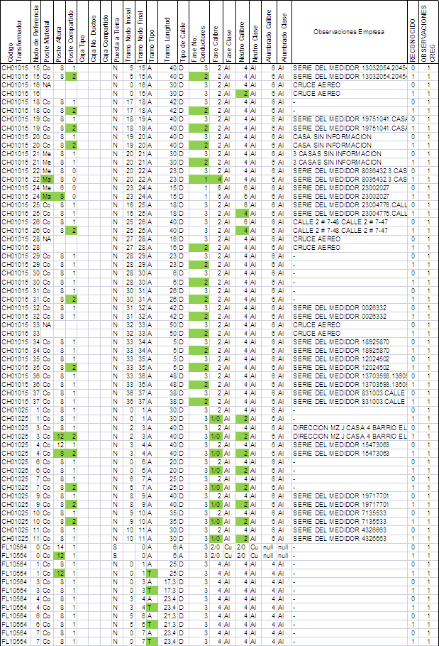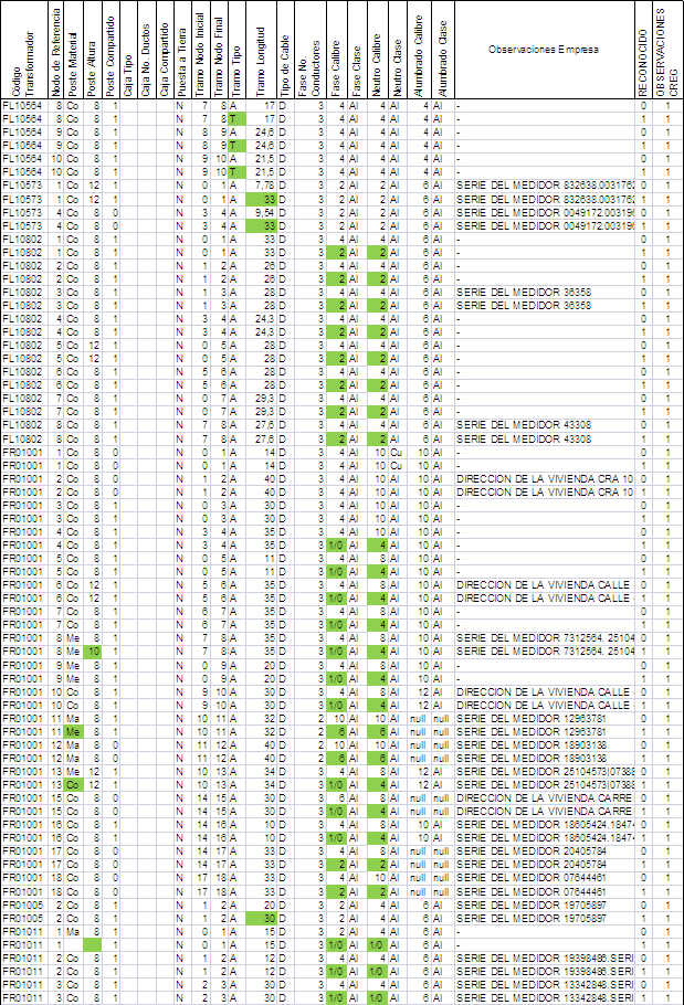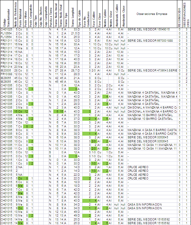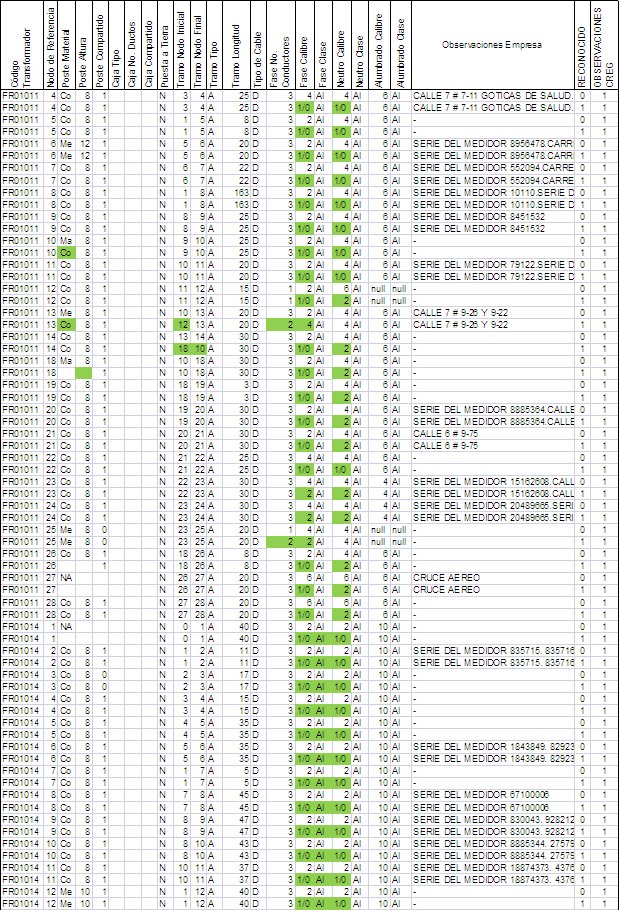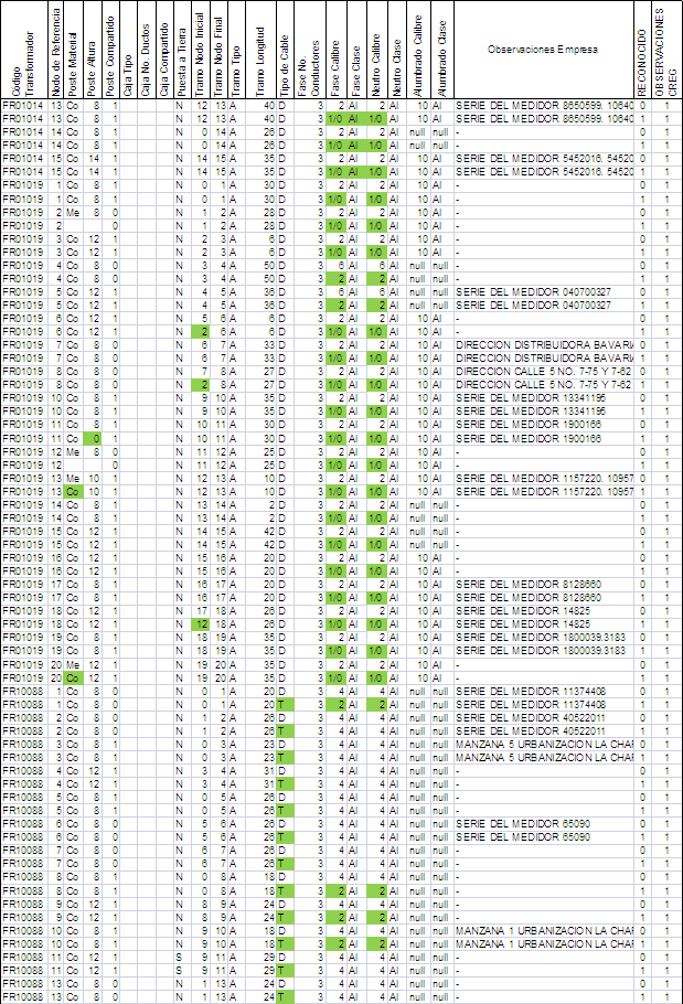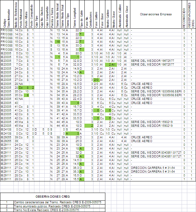 La convención utilizada en las bases de datos de activos consistió en incluir un uno (1) en la columna “Reconocido”, cuando el activo se tuvo en cuenta en los cálculos aprobados y un cero (0), en caso contrario. En los casos en que el activo no se reconoció o el registro (fila de la hoja electrónica) se cambió por otro, al cual se le modificó alguna de las características del reporte original del OR, se incluyó la correspondiente aclaración en la columna “Observaciones CREG”, como puede observarse en las demás tablas de activos entregadas al OR.