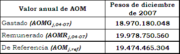 El AOM de Referencia se obtiene con el promedio entre el AOM gastado y el AOM remunerado que, de acuerdo con los valores mostrados arriba, resulta en $ 19.474.465.304 expresado en pesos de diciembre de 2007.