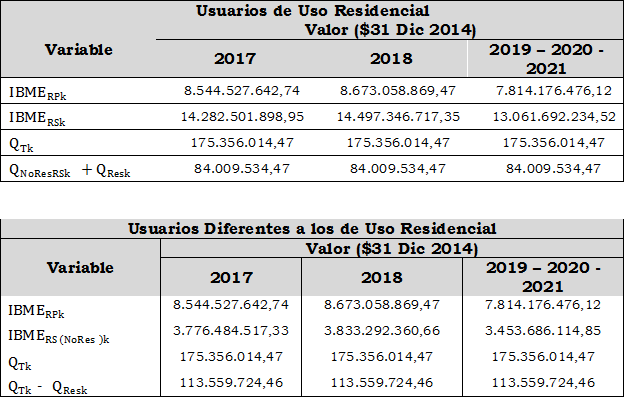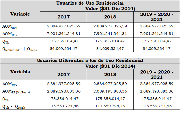 Aplicando la metodología contenida en la Resolución CREG 202 de 2013 y sus modificaciones y adiciones, se calcularon conforme a las formulas establecidas en los numerales 9.1.1.1. y 9.2.1.1. del artículo 9 para la componente que remunera los gastos de AOM, aplicable a usuarios de uso residencial y a usuarios diferentes a los de uso residencial, las siguientes variables principales:
