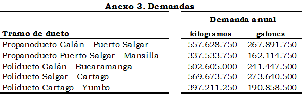 ARTÍCULO 5. DEMANDAS. Las demandas que sirvieron de base para el cálculo de los cargos que se aprueban mediante la presente Resolución, de conformidad con lo dispuesto en el artículo 9o. de la Resolución CREG 122 de 2008, corresponden a las presentadas en el anexo 3 de la presente Resolución.