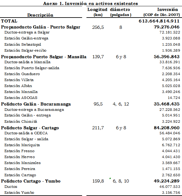 ARTÍCULO 3. INVERSIÓN EN ACTIVOS EXISTENTES. El valor de la inversión en activos existentes que se reconoce para efectos tarifarios, para el sistema de transporte descrito en el artículo 2 de la presente Resolución, es de COP 613.664.814.911 de diciembre 31 de 2007. La desagregación de esta inversión por grupo de activos se muestra en el anexo 1 de la presente Resolución.