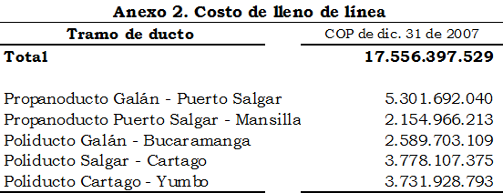 ARTÍCULO 4. LLENO DE LÍNEA. El valor del combustible del lleno de línea que se reconoce para efectos tarifarios es de COP 17.556.397.529 de diciembre 31 de 2007. La desagregación de este valor por grupo de activos se muestra en el anexo 2 de la presente Resolución.