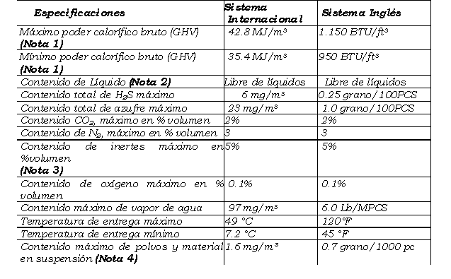 Cuadro 7. Especificaciones de Calidad del Gas Natural