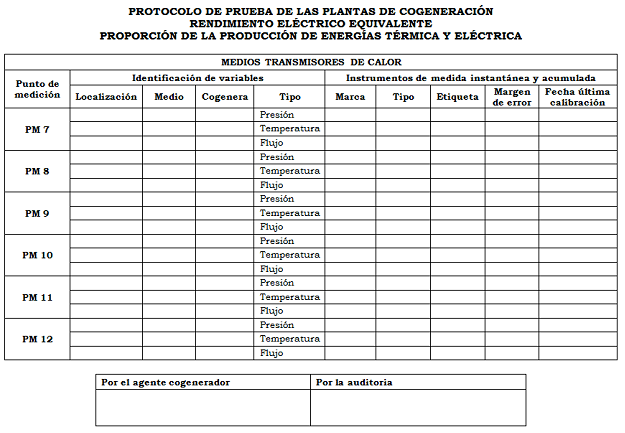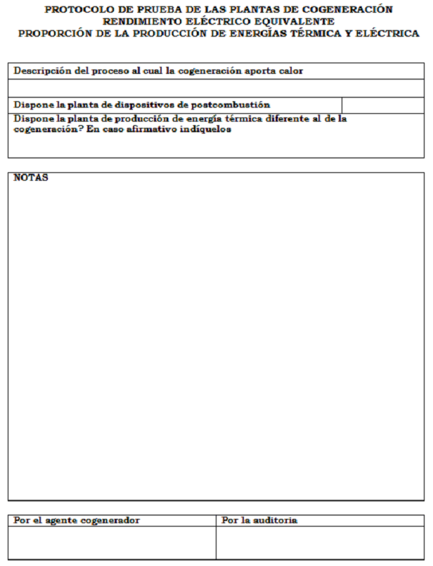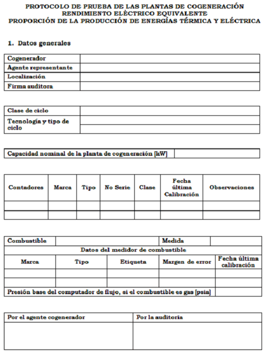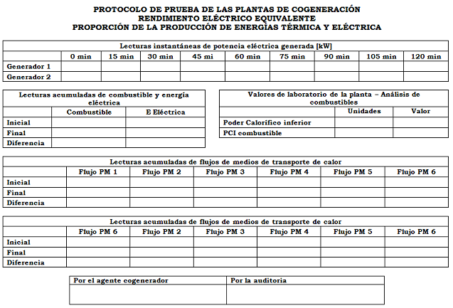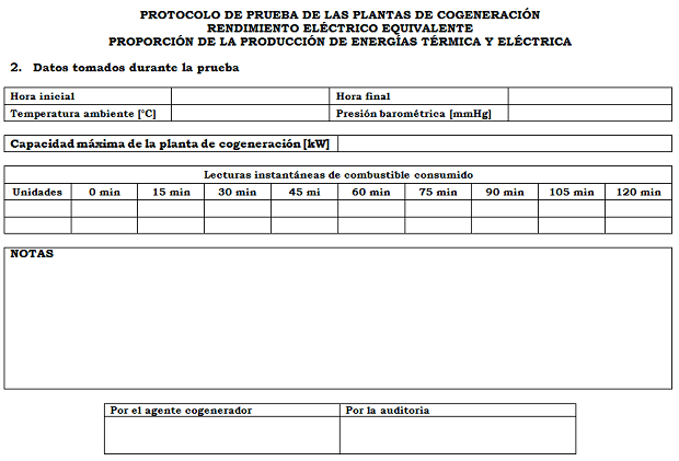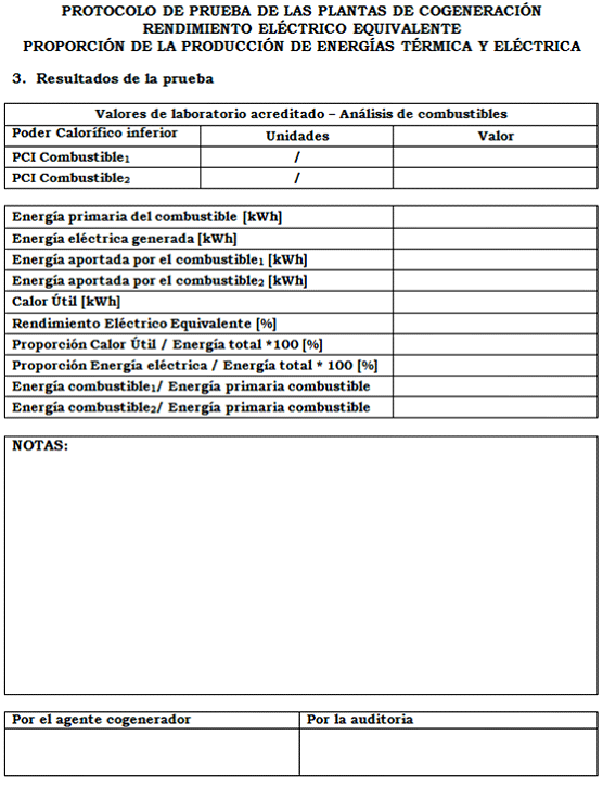 Como resultado de esta prueba se deberán obtener los valores del Rendimiento Eléctrico Equivalente (REE) y la Producción mínima de energía eléctrica y térmica en el proceso.