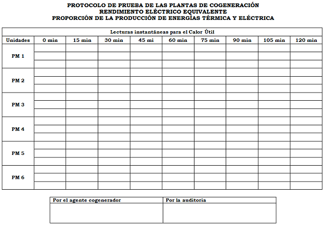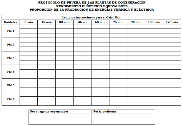 Durante la prueba se tomarán lecturas acumuladas, que serán la base de los cálculos de Energía Primaria, Calor Útil y la energía de cogeneración y lecturas instantáneas que servirán primordialmente para verificar que las condiciones de operación de la unidad permanezcan estables durante la prueba.