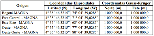 Fuente: Documento con los Tipos de Coordenadas manejadas en Colombia. Instituto Geográfico Agustín Codazzi, IGAC, Mayo 2004.