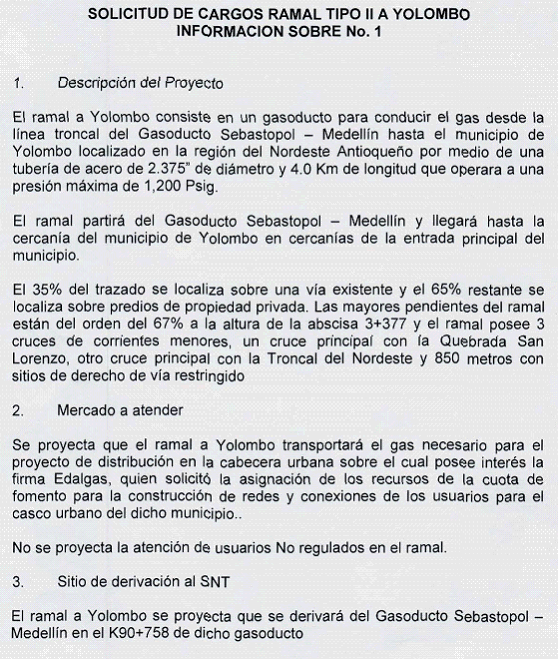 De conformidad con el artículo 25 de la Resolución CREG 126 de 2010, la empresa TRANSMETANO E.S.P. S.A. hizo una solicitud de cargos para el ramal tipo II al municipio de Yolombo.