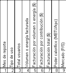 4. Volumen o energía facturada: Para el caso de los comercializadores-distribuidores, corresponde al consumo total facturado en el periodo, dado en metros cúbicos (m3). Para el caso de los comercializadores y comercializadores-productores, corresponde a la energía facturada en el periodo, dada en millones de BTU (MBTU). Y para el caso de los transportadores, corresponde al volumen transportado en el periodo, dado en miles de pies cúbicos día (kpcd).