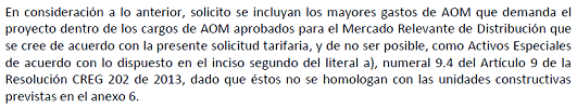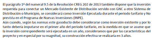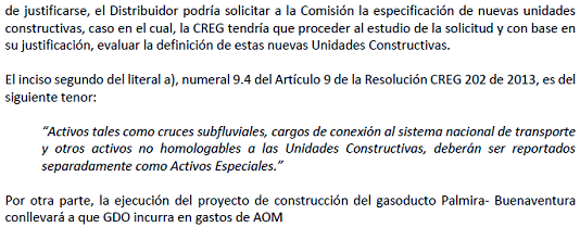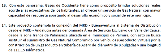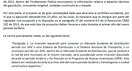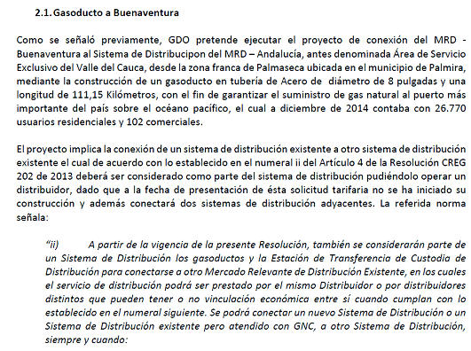 De conformidad con lo establecido en el numeral ii) del Artículo 4 y Anexo 1 de la Resolución CREG 202 de 2013 y sus modificaciones, el Director Ejecutivo de la Comisión de Regulación de Energía y Gas se permite informar que la empresa GASES DE OCCIDENTE S.A. E.S.P. incluyó en su solicitud tarifaria para la definición de cargos de distribución, las inversiones y gastos de AOM referentes al proyecto “Gasoducto de Conexión Buenaventura” y con el cual espera conectar el mercado relevante correspondiente a la zona geográfica que dejo de ser Área de Servicio Exclusivo denominada Valle del Cauca con el mercado de Buenaventura, este último atendido actualmente con gas natural comprimido - GNC.