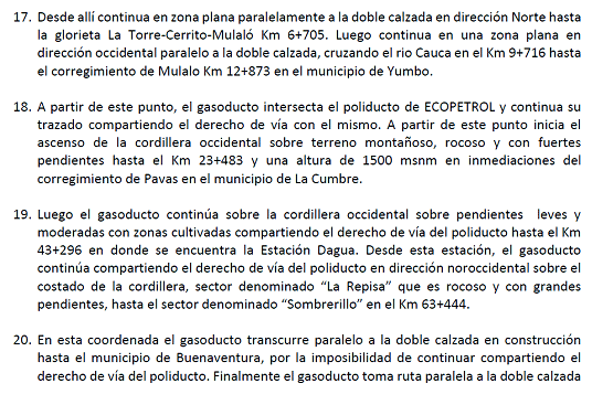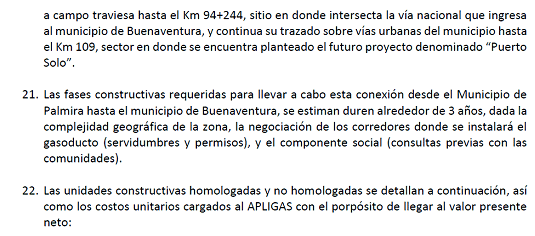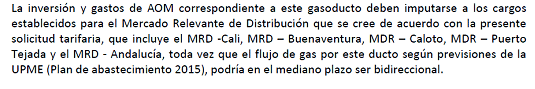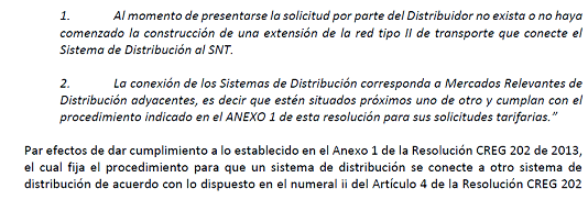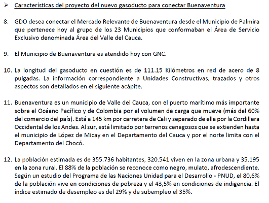 De acuerdo con lo dispuesto en la Resolución CREG 202 de 2013 y sus modificaciones se divulga apartes de la solicitud de la empresa en donde se precisan las características técnicas del gasoducto de conexión propuesto. Esto con el propósito de que las empresas transportadoras u otros agentes interesados puedan, dentro de los treinta (30) días siguientes a la publicación de esta circular, manifestar si tienen el interés de desarrollar un proyecto de transporte que cubra el mercado de Buenaventura incluidos otros mercados o municipios adicionales y para lo cual el agente interesado debe presentar solicitud tarifaria en los términos establecidos en la Resolución CREG 126 de 2010 o aquellas que la modifiquen o sustituyan.
