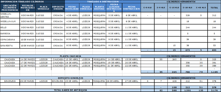 En respuesta a la anterior disposición regulatoria, la empresa GASES DE ANTIOQUIA S.A E.S.P., que realiza las actividades de distribución y comercialización minorista en el Departamento de Antioquia, mediante comunicación con número de radicados CREG E-2016-001354, E-2016-001660 informó la cantidad de cilindros universales remanentes en su poder y la programación de movilización y destrucción de los mismos.
