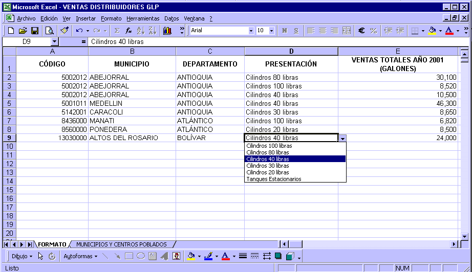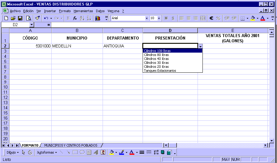 § Información de ventas de GLP en galones, desagregada por municipios o centros poblados atendidos (Ver Hoja MUNICIPIOS Y CENTROS POBLADOS del archivo adjunto), para cada tipo de presentación Cilindros de 100, 80, 40, 30 y 20 libras, y tanques estacionarios.. Si bien algunas empresas Comercializadoras Mayoristas realizan también la actividad de Distribución, en esta oportunidad ÚNICAMENTE se deben reportar las ventas como DISTRIBUIDOR, es decir, ventas a usuarios finales.