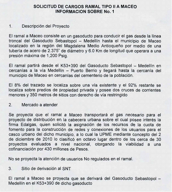 De conformidad con el artículo 25 de la Resolución CREG 126 de 2010, la empresa TRANSMETANO E.S.P. S.A. hizo una solicitud de cargos para el ramal tipo II al municipio de Maceo.