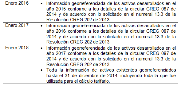 Por su parte, la Circular CREG 114 de 2014 estableció un cronograma para la entrega gradual de la información de la siguiente forma: