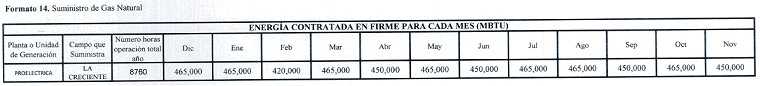 De acuerdo con la información reportada por los productores-comercializadores y los transportadores a la CREG en cumplimiento de las Resoluciones CREG-089 de 2013, se informa que los índices IMM y TCR para la Planta PROELCTRICA para el período comprendido entre el 1 de diciembre de 2016 y el 30 de noviembre de 2017 tienen un valor de 1.0.