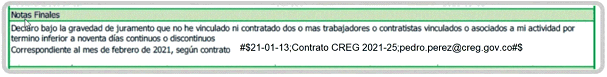 A continuación, los dos ejemplos de la parametrización que debe ir en las notas u observaciones de la FE, ND y NC para cada caso (contrato o caja menor), donde el supervisor de la CREG se llama Pedro Pérez.