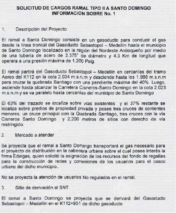 De conformidad con el artículo 25 de la Resolución CREG 126 de 2010 la empresa TRANSMETANO E.S.P. S.A. hizo una solicitud de cargos para el ramal tipo II al municipio de Santo Domingo.
