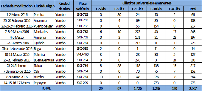 Los cilindros serán traslados al taller de CINSA, ubicado en Km 2.5 Vía Vijes – Mulalo en la cuidad de Yumbo, Valle del Cauca; para su destrucción en las siguientes fechas: